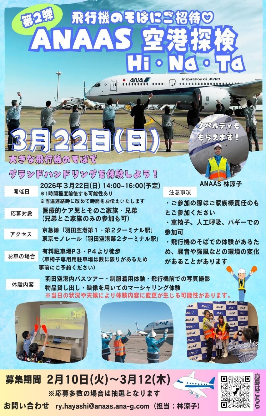 大きな飛行機の近くで写真撮影、制服着用体験、空港内バスツアーなど、羽田空港に関する様々な体験ができます。詳細は、下記のチラシをご参照ください。